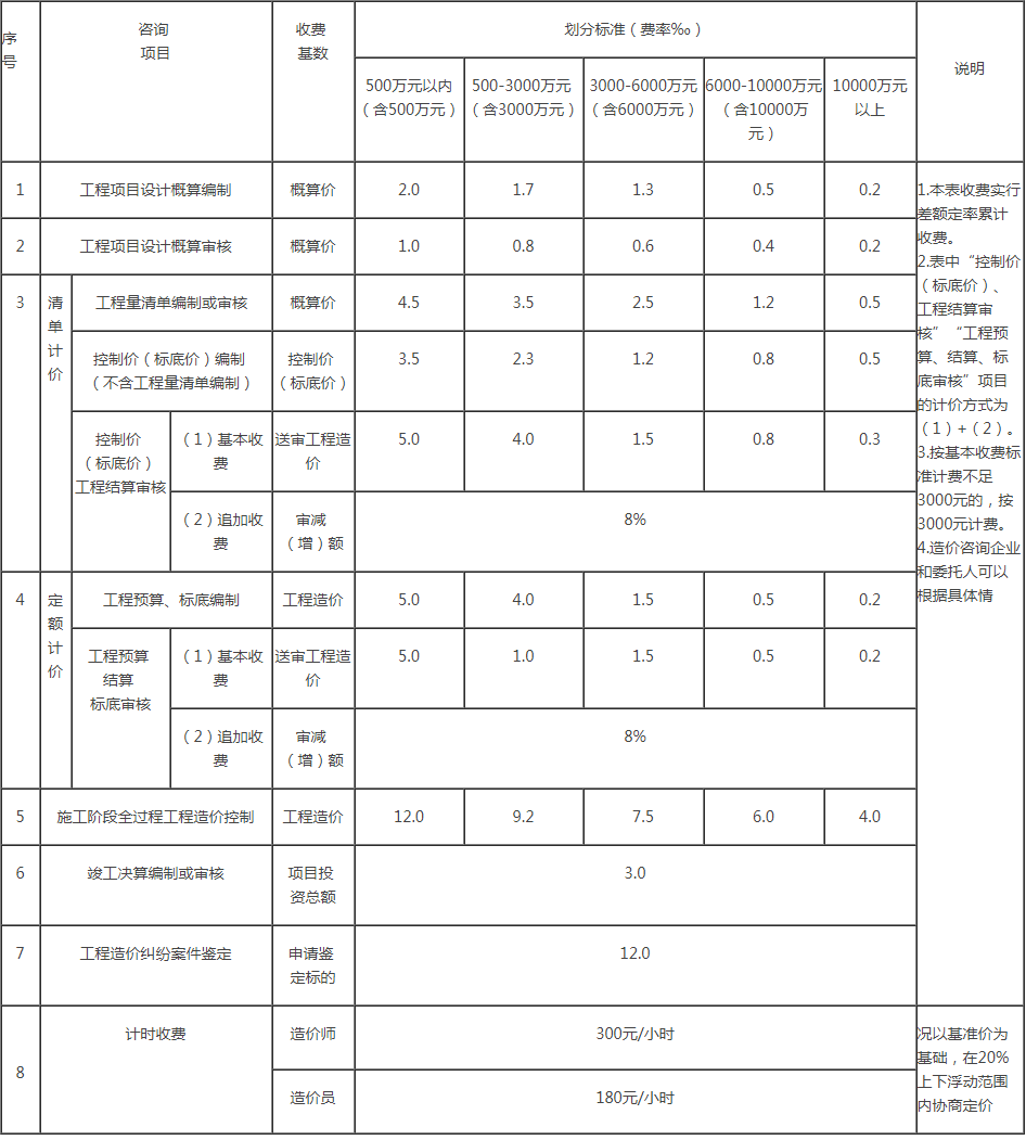 以工程施工費與設備購置費之和最為計費基數,采用差額定率累進法計算。