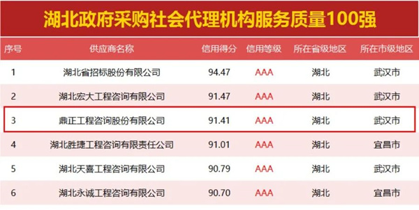 鼎正印記丨名列三甲 榮登湖北政府采購社會代理機(jī)構(gòu)服務(wù)質(zhì)量百強(qiáng)榜