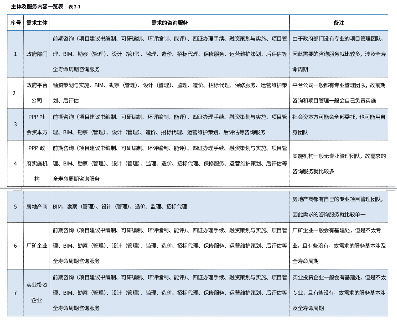 不同的投資主體對全過程咨詢需求的服務內容是不一樣的,一是因為投資主體本身性質的不同,法律法規所規定的也不一樣,二是投資主體自身團隊管理水平的因素所需求的咨詢服務也不一樣,以下通過表格列述不同的主體所需求的咨詢服務: