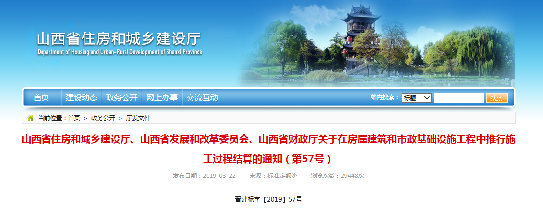 2019年3月22日,《山西省住房和城鄉建設廳、山西省發展和改革委員會、山西省財政廳關于在房屋建筑和市政基礎設施工程中推行施工過程結算的通知(第57號)》(以下簡稱《通知》)發布,從5月1日起,在房建和市政工程中推行施工過程結算: