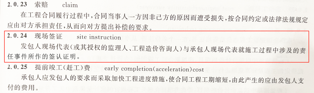 依據(jù)《建設(shè)工程工程量清單計(jì)價(jià)規(guī)范》(GB50500-2013)第2.0.24條對(duì)現(xiàn)場(chǎng)簽證的定義:“發(fā)包人現(xiàn)場(chǎng)代表與承包人現(xiàn)場(chǎng)代表就施工過程中涉及的責(zé)任事件所作的簽認(rèn)證明。”
