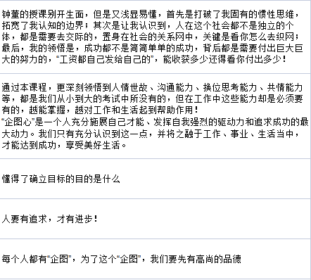 開堂的第一節(jié)課,他以《打開企圖心》為主題,以提問為主的方式,激發(fā)線上線下的學員深入思考:我們?yōu)楹味鴬^斗?我們因何而得到?既不是秀才(編者注:此語境下的含義為生活優(yōu)渥者)也不是落榜者(編者注:此語境下的含義為因失敗而發(fā)憤圖強者)的我們又當以什么作為自身前進的動力?……