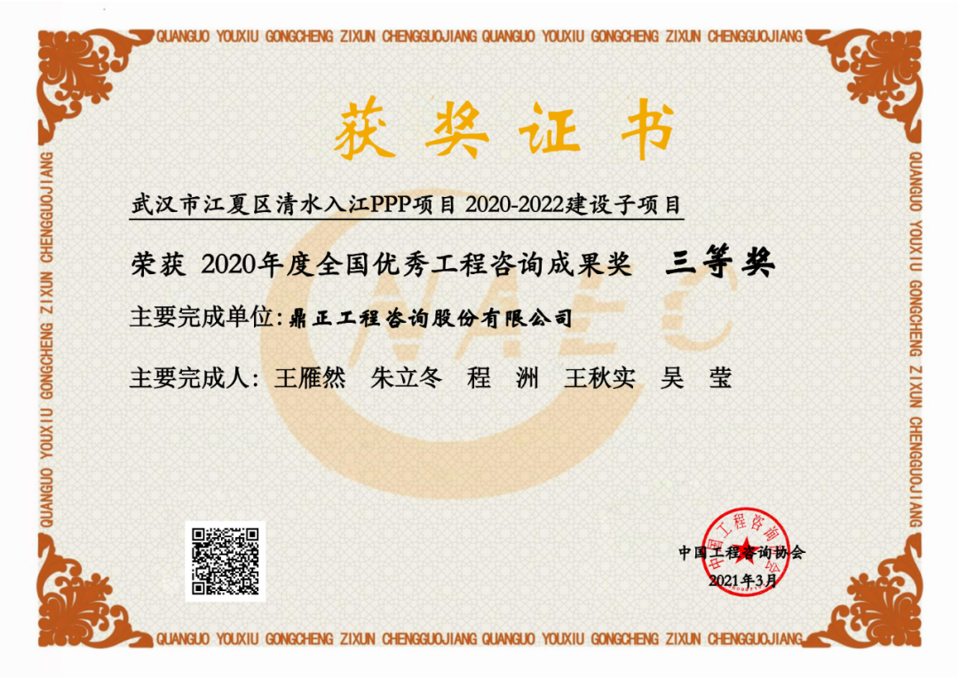 每?jī)赡暝u(píng)選一次,2018-2019年,我司大悟縣宣化店旅游名鎮(zhèn)建設(shè)PPP項(xiàng)目首獲“全國(guó)優(yōu)秀工程咨詢成果獎(jiǎng)”榮譽(yù);2020-2021年,我司武漢市江夏區(qū)清水入江PPP項(xiàng)目再獲該獎(jiǎng);2022-2023年,我司東數(shù)西算貴安新區(qū)算力立業(yè)集群配套項(xiàng)目第三次獲得此殊榮。